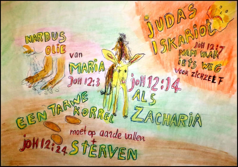 In order to better incorporate the Bible into me, it helps me to take notes on a drawn or painted flat surface. This flat image-longuage have small reminders for me for quickly bring the story back up again. Image-language is a language in what I grew up and is another language as word-language, an other language as sound-language and even another as movement-language. Perhaps they are not entirely complete for everyone who looks at it and of course always welcome or additions. So if you find that something very important is missing or has been displayed incorrectly, be sure that I am very happy that you let me know: